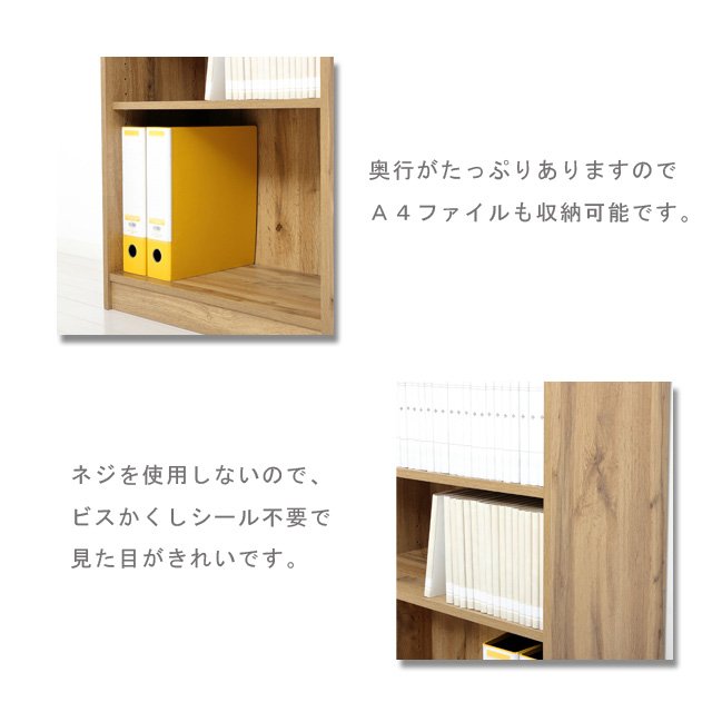 | 規格 | 【JAN】 4954877255017(ホワイト) 4954877255024(ナチュラル) 4954877255031(ダークブラウン) 【材 質】プリント紙化粧繊維板 【仕 様】組立式 【生産国】マレーシア 【ポイント】 ●幅45cm!ドライバー不要でらくらく組立本棚です! ●ネジ・ドライバーを使用しないので、作業時間を短縮できます。 ●可動棚3枚付きで、収納物に合わせて位置を変えられます。(固定棚は2枚) ●奥行がたっぷりありますのでA4ファイルも収納できます。 ●ネジを使用しないので、ビスかくしシール不要で見た目がきれいです。 ●背面の補強バー(スチール製)で揺れを軽減します。 ●無駄のないシンプルなデザインですので、さまざまな場所でお使いいただけます。 ●お部屋に合わせやすい木目柄、ホワイト・ナチュラル・ブラウンの3色展開です。 |